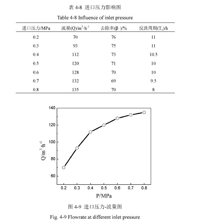 考慮到隨著陶瓷膜的堵塞,流量必然要不斷下降,所以適量提高初始運行流量將起到一個平衡作用來確保處理量。綜合處理效果和經(jīng)濟因素,確定進口壓力為,反洗時間。